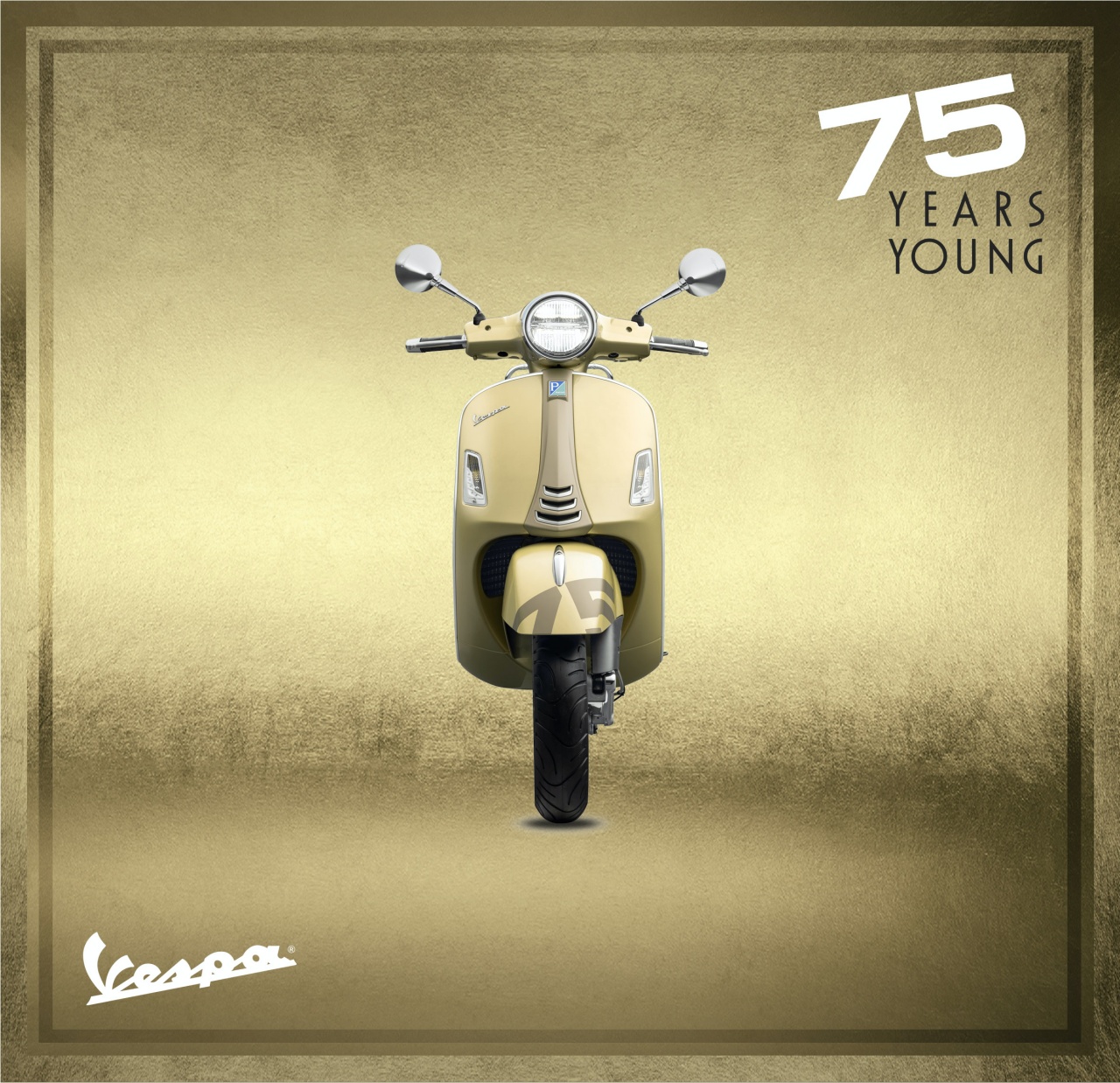 Phiên bản đặc biệt mang trên mình con số biểu tượng "75" vàng nhám đồng nổi bật trên lớp sơn vàng ánh kim thanh lịch, tông màu thịnh hành trong những năm 1940. Được phát triển riêng cho phiên bản đặc biệt này, màu vàng ánh kim vừa thể hiện tính di sản vừa gợi lên tinh thần đổi mới và tính thời trang của Vespa. Sắc vàng nhám đồng con số biểu tượng “75” trên hai bên hông xe, chắn bùn và cà vạt đồng màu như một cách điệu tân thời của xu hướng phối màu những năm 40, kết hợp với tấm biển logo kỷ niệm.